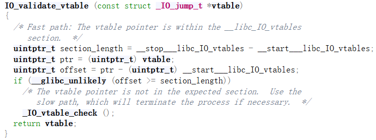 现代的libc库中新增了保护,使得曾经的方法不可用,具体的方式为vtable pointer的合法性校验